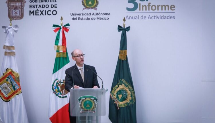 Durante la lectura del tercer informe anual de actividades de la Administración 2021-2025 de la UAEMéx, a cargo del rector Carlos Eduardo Barrera Díaz, el servidor público puntualizó que en la actualidad es imposible pensar al Estado de México y al país sin la Máxima Casa de Estudios mexiquense.