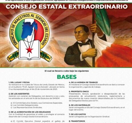 En respuesta a las demandas surgidas en las Mesas de Trabajo del XLVI Consejo Estatal Ordinario, el Sindicato de Maestros al Servicio del Estado de México (SMSEM) emitió la convocatoria para su Consejo Estatal Extraordinario, cuyos trabajos estarán orientados, principalmente, hacia la actualización de sus reglamentos internos.