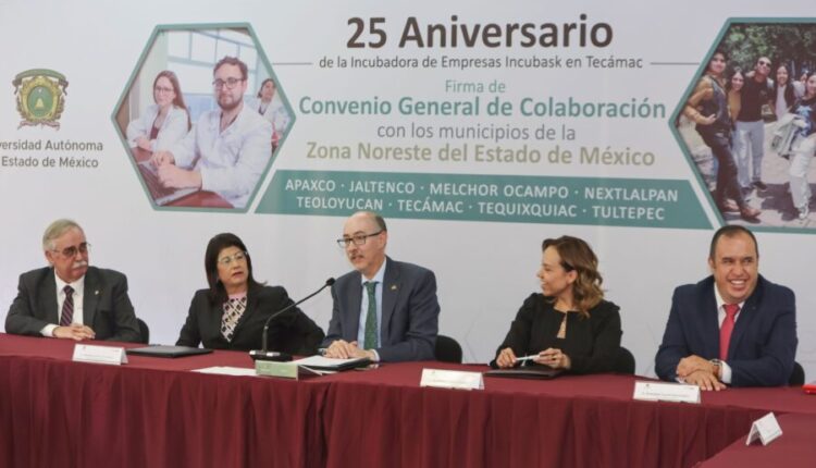 Tecámac, Méx; 10 de octubre de 2023.* En el marco del 25 aniversario de su incubadora de empresas Incubask, la Universidad Autónoma del Estado de México (UAEMéx) firmó un convenio general de colaboración con los municipios de Apaxco, Jaltenco, Melchor Ocampo, Nextlalpan, Teoloyucan, Tecámac, Tequixquiac y Tultepec.